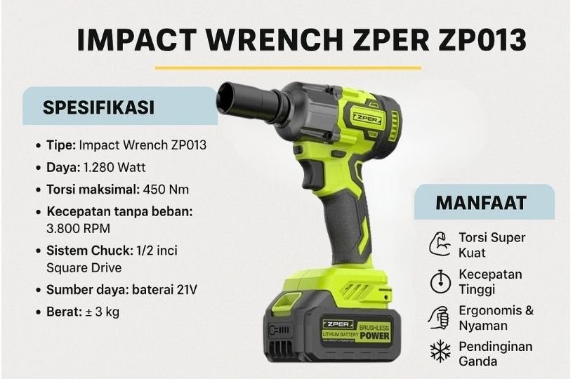 Impact Wrench ZPER ZP013 adalah alat yang wajib dimiliki oleh teknisi bengkel dan mekanik profesional. Dengan kombinasi tenaga besar, kecepatan tinggi, desain ergonomis, dan fitur keamanan, produk ini terbukti mampu meningkatkan produktivitas dan kualitas kerja.
